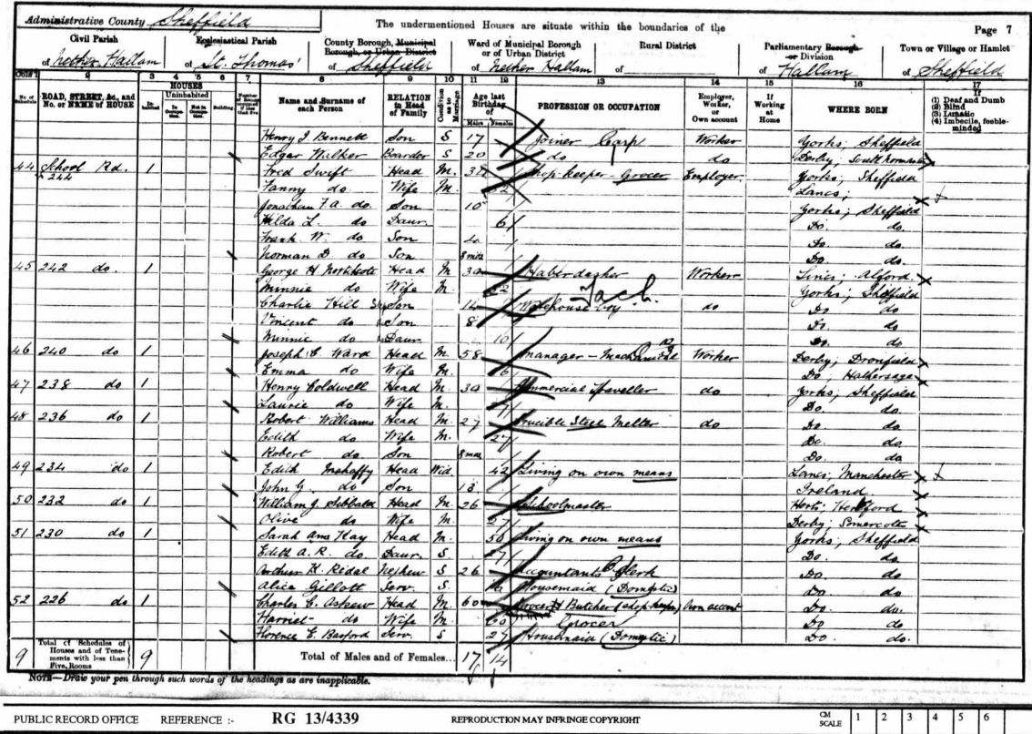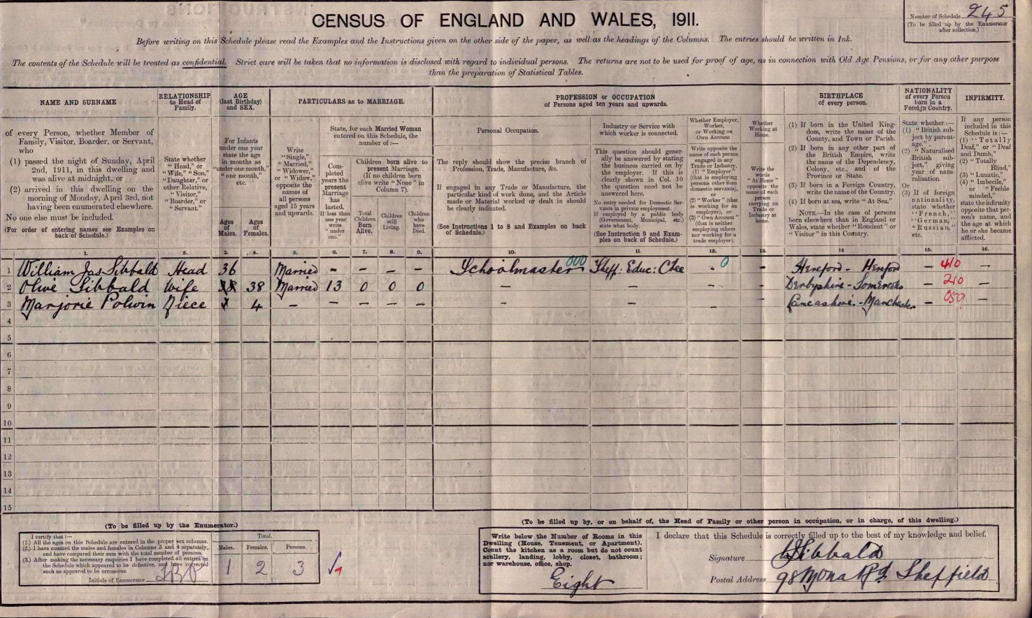 The following two forms are from the 1901 and 1911 Census respectively and it shows a William James Sibbald and his wife Olive Sibbald (nee Peach) living at 232 School Road Crookes Sheffield in 1901 and then in 1911, 98 Mona Road Crookes Sheffield