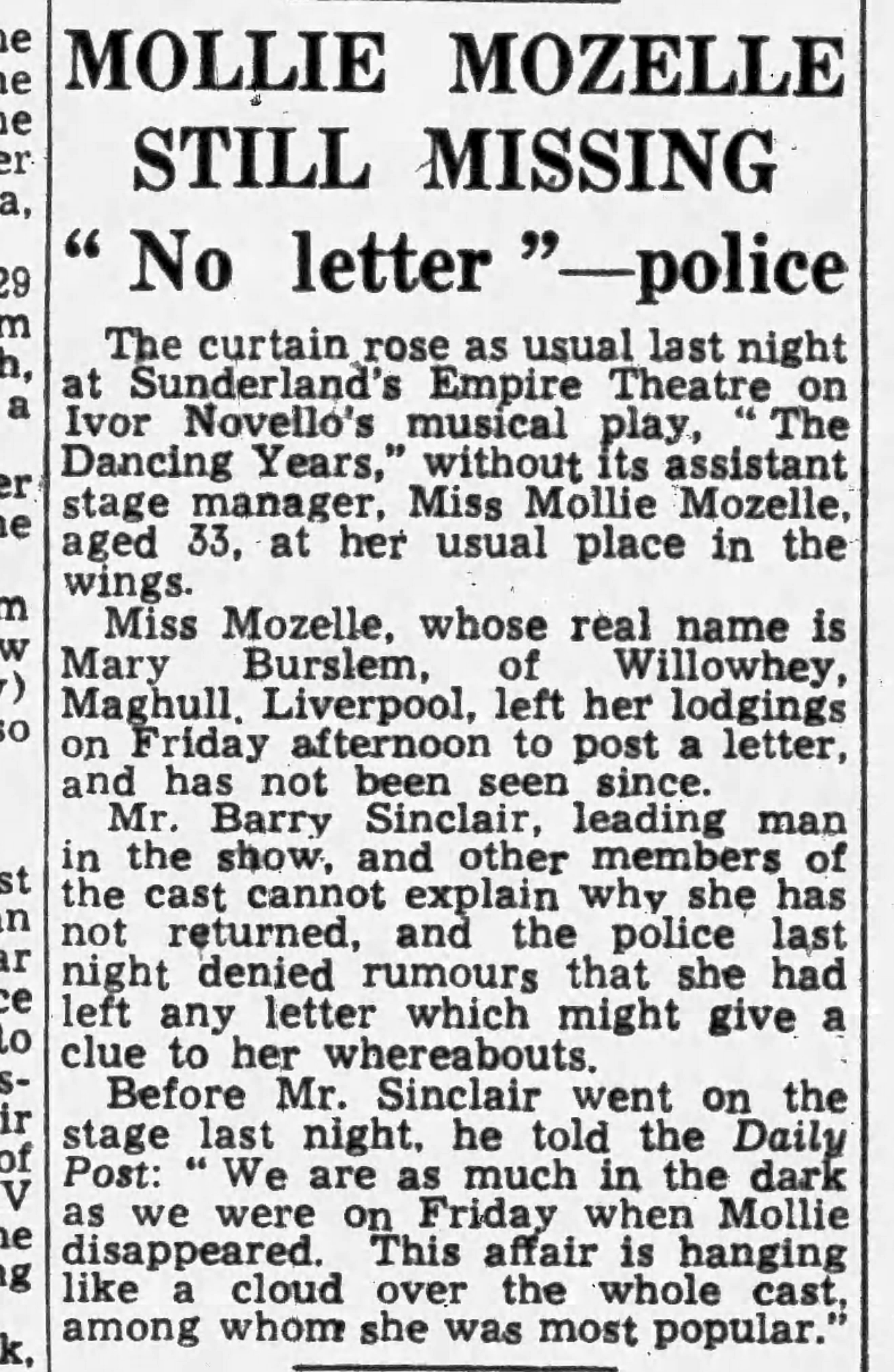 Mary Burslem was born in 1916. Adopting the stage name of “Molly Mozelle”, she was talented, she was popular and had a seemingly happy outlook amongst her colleagues, taking roles as both a dancer and an assistant stage manager at the Empire, but beneath it all laid a troubled love live where she had never been able to find the man quite right for her. It was known that she had engaged in a