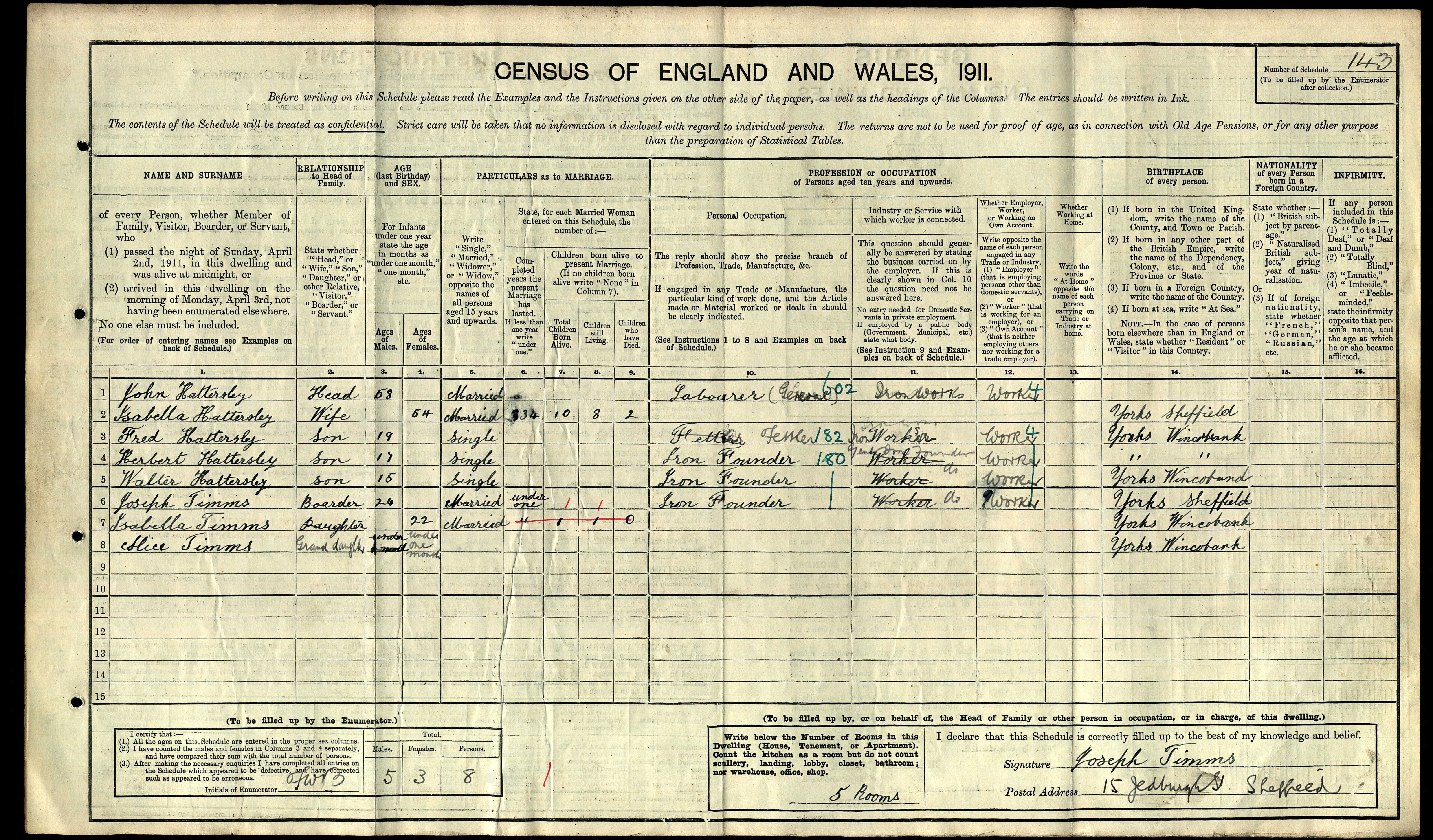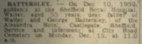 HATTERSLEY, Walter (Licensed Victualler, age 55). Died at Royal Hospital; Buried on December 15, 1952 in Consecrated ground; Grave Number 1039, Section U1 of City Road Cemetery, Sheffield.