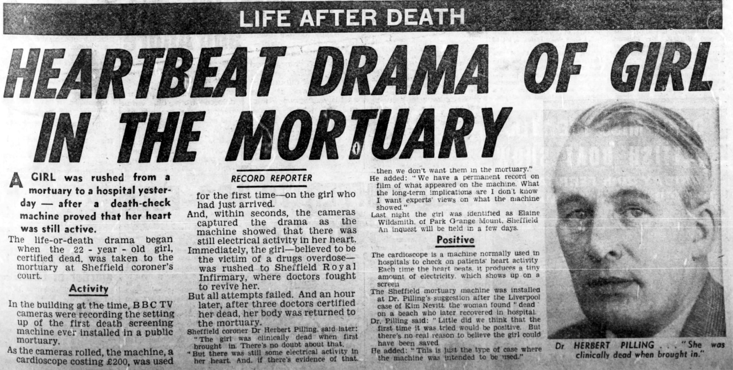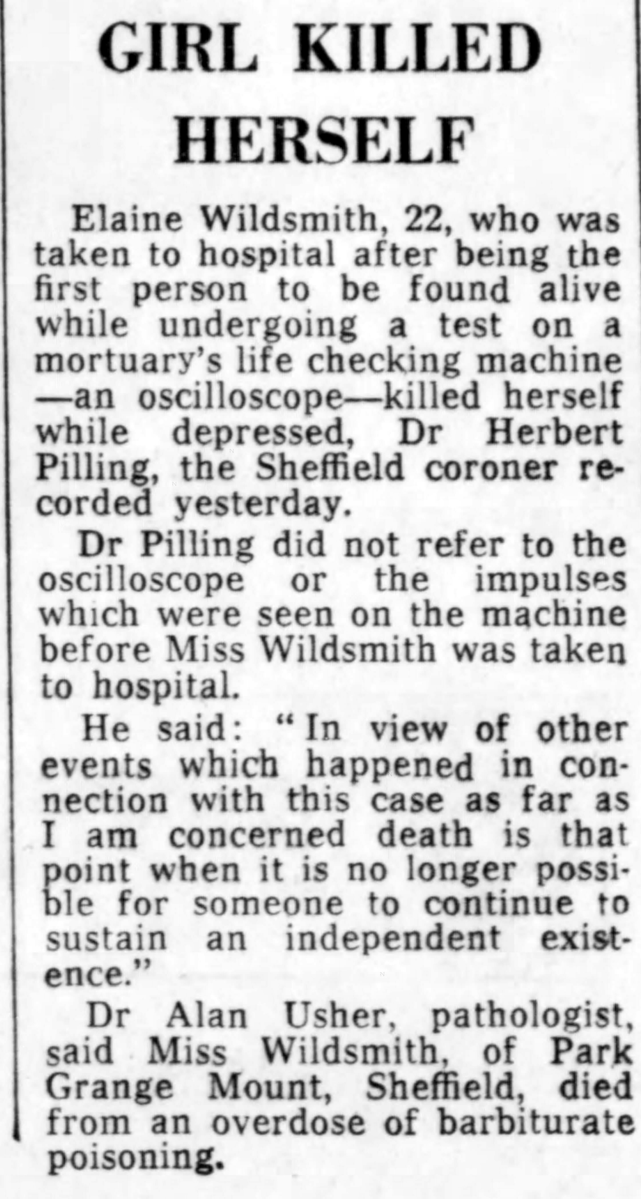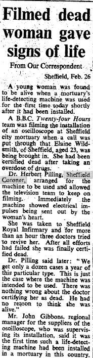 I must admit that when I saw this article in The Scotsman dated 27th February 1970, I was rather incredulous. The lady concerned. Elaine Wildsmith, had been certified dead as a result of a drug overdose and had been taken to the mortuary. Purely by chance her arrival at the mortuary coincided with the installation of a life-detecting machine, the first one to be installed in the country. And it immediately detected signs of life emanating from the recently deceased body of Elaine Wildsmith. She was transferred to Shefield's Royal Infirmary where further attempts were made to resuscitate Elaine but after an hour, she was certfied dead for the second time.