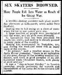 THE SKATING ACCIDENT NEAR SHEFFIELD A later message from Sheffield with regard to the skating disaster says:- The disaster occurred on the Chesterfield - Stockwith Canal at Churchtown near Killamarsh. The victims were:- Fred Northridge (17), pony driver, Killamarsh; Harry Milner (18), pony driver, Killamarsh: Annie Sedgewick, (12) , Killamarsh; Mary Elizabeth Watson, (6) Killamarsh; Alice Read, pottery hand Chesterfield; and Mary Ann Ranskill, (18), pottery hand Chesterfield; The canal which is not now used for traffic had been frozen over for some days, and had been the rendezvous of large numbers of young people. On Saturday, there was an unusually large number of young people on the ice, when suddenly there was an alarming crackling sound. Before anyone had time to realise what was happening, the six victims, who were close together were plunged into the water, which was something like nine feet deep. The alarm was raised, and although gallant attempts ate rescue were made, the unfortunate skaters perished. Dragging operations commenced, and the bodies were recovered within the hour. Miss Read was engaged to be married to Tom Northridge, brother of Fred Northridge, the banns having been read out the second time at Killamarsh the same morning. |