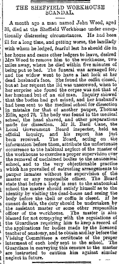 "Mr. Basil Cane, Poor Law Inspector held an enquiry at the Sheffield Workhouse yesterday concerning the removal of the body of a young man named John Wood which was taken by mistake to the Medical School instead of that of an old man named Ellis. Wood it appeared had been received into the hospital suffering from consumption and died within ten minutes of his admission. On the widow coming to claim the body for burial she was shown a coffin on which was a plate bearing the name of "John Wood age 36". On the lid being removed however she found that the coffin did not contain Wood's body but that of an old man named Ellis. Search was made and Wood's body was ultimately found laid on a slab at the Medical School ready for the anatomical lecturer and his students. Mrs. Wood declared that when the body was brought back to the workhouse there were several cuts to the neck as if inflicted by a lancet. It was explained that the cuts had been inflicted by the porter at the school in the process of shaving. The mistake arose through the recent appointment of a new man to take charge of the dead-house, and the failure to put cards bearing the names and ages on the bodies"