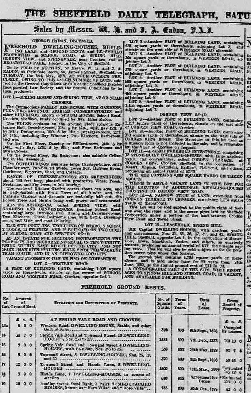 George died prior to 1899 and all his properties and land that he had massed in the district were auctioned. This is the notice that appeared in the local newspaper The Sheffield Daily Telegraph. It is dated Saturday 6th May 1899. Spring Hill is down as Lot 13. The auction took place on Tuesday 16th May 1899 at Eadon's salerooms in St James Street Sheffield