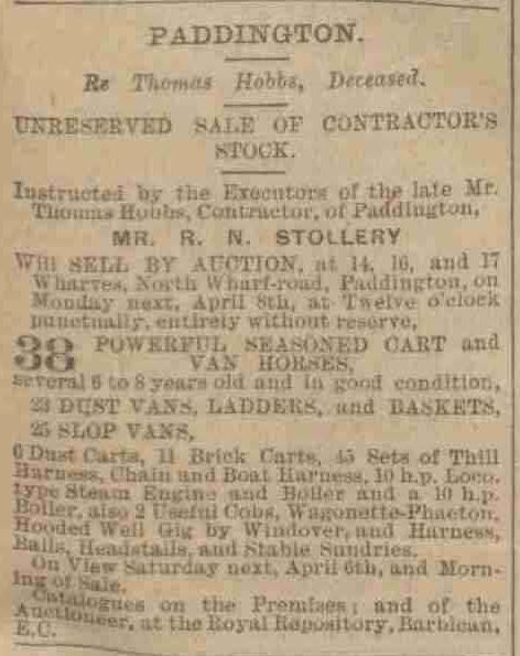His father was also called THOMAS HOBBS and on the marriage certificate of Thomas and Emma he gives his occupation as Contractor. This I believe formed the basis of the business was based in wharves 14,15 and 17 Wharf Road, Paddington, London which was adjacent to Paddington railway station.