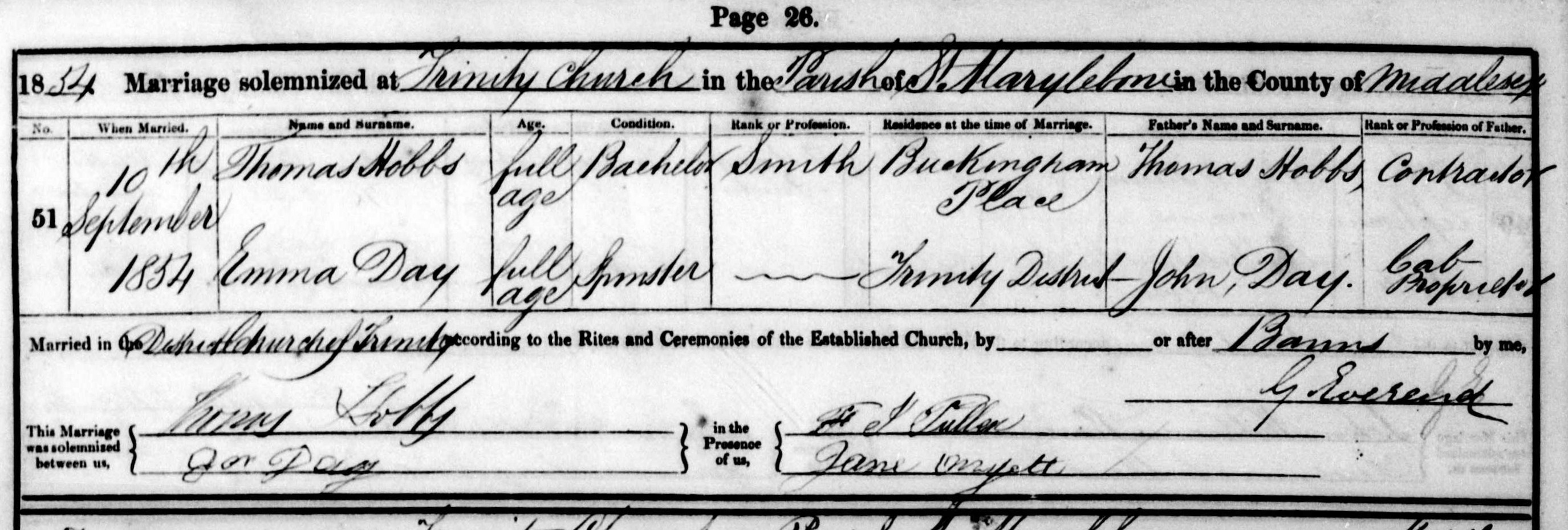 THOMAS HOBBS was born in 1835 in Kensington London and was a Smith at the time of his marriage to EMMA in 1854.They were married on 10th September 1854 at Trinity Church which is situated in the Parish Of St Marylebone. His place of residence was given as Buckingham Place whereas Emma's was given as the Trinity District