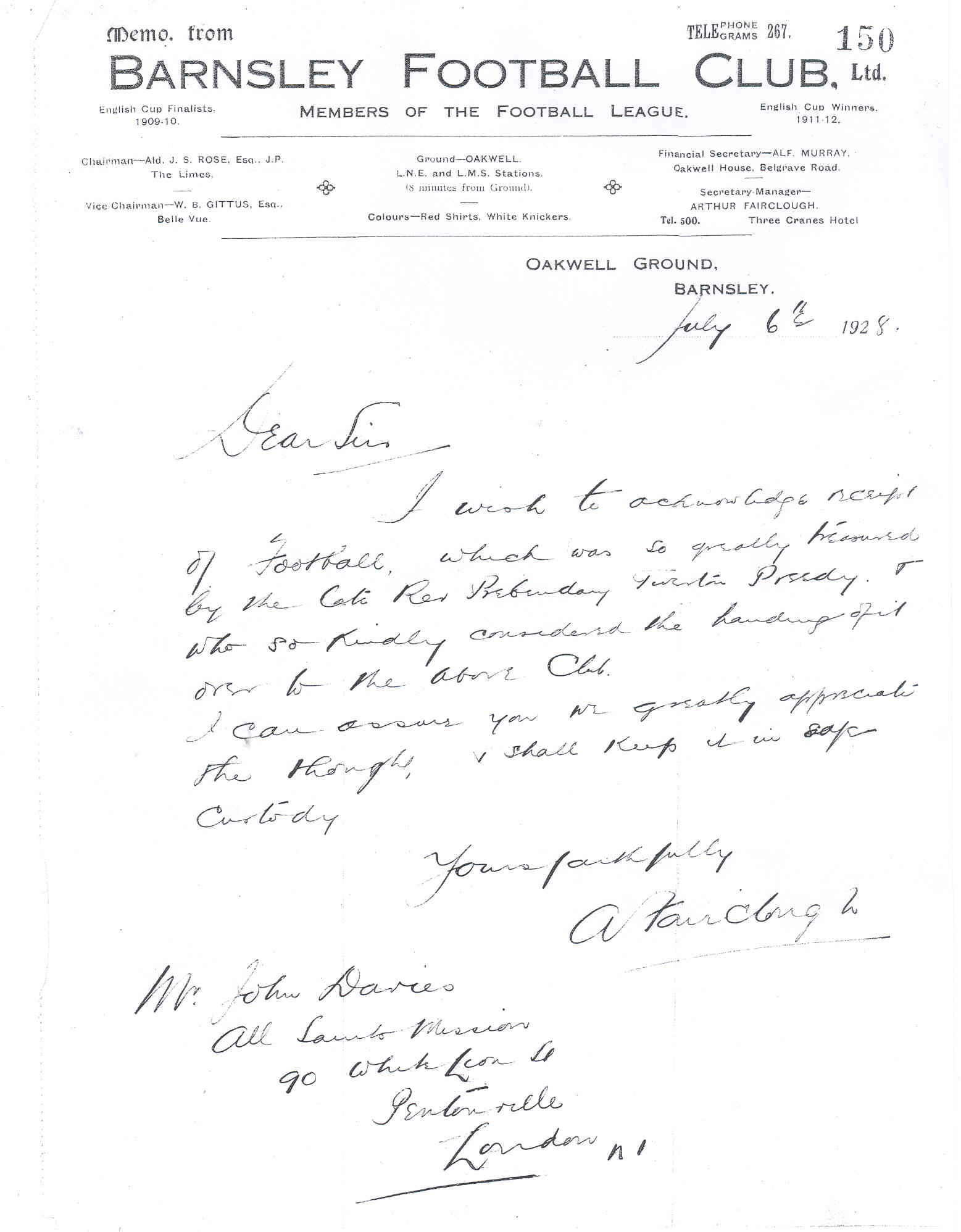 I started out this article just wanting to know what became of the match ball that was used in the 1912 F.A.Cup Final, the only Cup Final to be played in Sheffield. Even though he had left Barnsley sixteen years earlier in 1896, Father Preedy's legacy to the club must have been formidable and long lasting. He was the guest of honour at the post match banquet held at the Clarence Hotel and was presented with the match ball as a tribute by the club to its founder. For many years, it was kept on a stand in his study at the Mission Hall but Father Preedy requested that it be returned to Barnsley F.C. on his death. Mr John Davies, his executor carried out his wishes and the ball was returned to Barnsley Football Club.