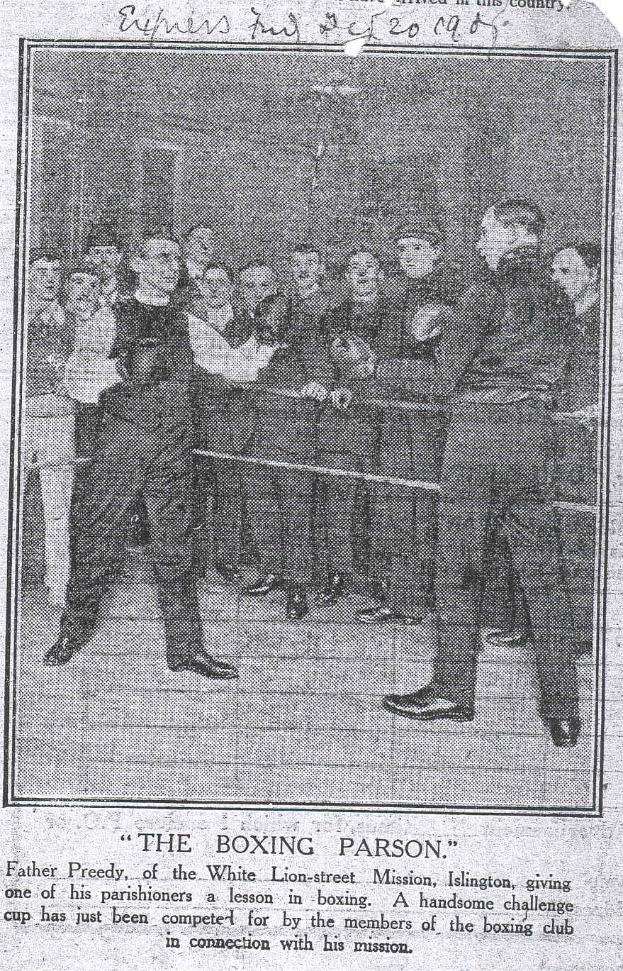 In the 1901 Census there is an entry for a Tiverton Preedy "Clergyman - Clerkenwell Church of England - age 38". He had been at the All Saints Mission for five years. He was not a very tall man 5ft 5" and he had a rather benign appearance. However he was a very good boxer, and in 1906 he erected a boxing ring in the crypt under the Mission Hall. It was used by the likes of Matt Wells, Dick Smith and Pat O'Keefe in preparing for their serious championship fights. Matt Wells was the first boxer to represent Great Britain at the Olympics in 1908. In later years Len Harvey worked out there. Terry Allen who was later to become world flyweight champion had his boyhood lessons in the gym. Overseeing the gym was Father Preedy. An article written after his death noted "one look at Preedy's steely eyes, the stocky figure and the rock-like fists which he was always prepared to put up without even removing his "dog's collar" made it clear that he was not a man to trifle with"