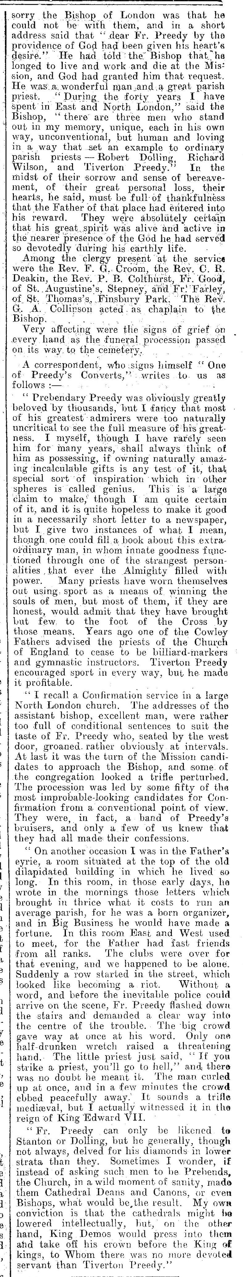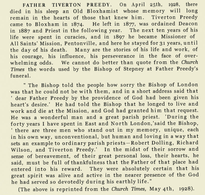 In the last year of his life Tiverton suffered from chronic heart disease and on 28th April 1928 Father Preedy died in his sleep at the age of 65. As a mark of respect the local market was shut on the day of the funeral and thousands turned out to pay their respects to a man who had been an integral and well loved member of the local community for over thirty years. It must have been a moving occasion. The funeral was held at the Mission Hall and was conducted by the Bishop of London. There is a short transcript of the sermon that was read at the service. Afterwards, Father Preedy was interred at Islington Cemetery . The Church Times dated 27th April 1928 gave a fulsome tribute to the life and deeds of Tiverton Preedy