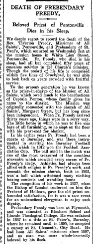 In recognition of his great work and devotion over many years in the area Father Preedy was appointed a Prebendary of St Pauls Cathedral in 1926. He was an exceptionally popular person in the area and this is shown in the letter from Fulham Palace (pdf file) that was sent to Father Preedy offering him the Prebend. It was a rare distinction for a unbeneficed priest