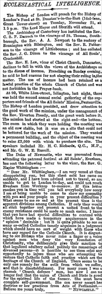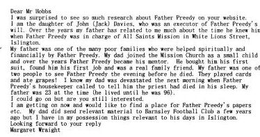 I would like to place on record the help and assistance given to me by Father Shaun Richards of St Silas's Church Pentonville London - it was greatly appreciated. And also Mr Bob Davenport for the reports from The Church Times