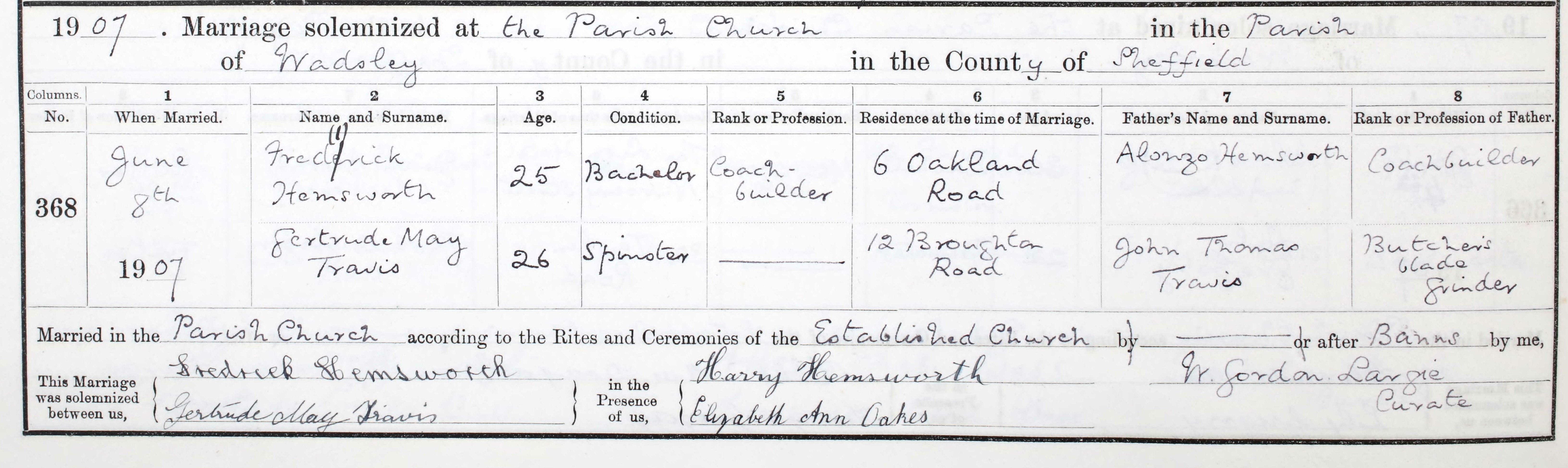 FRED married GERTRUDE MAY TRAVIS in the June quarter of 1907. Fred was the twin brother of HARRY. This is their magnificent wedding photograph taken at 12 Broughton Road Hillsborough Sheffield