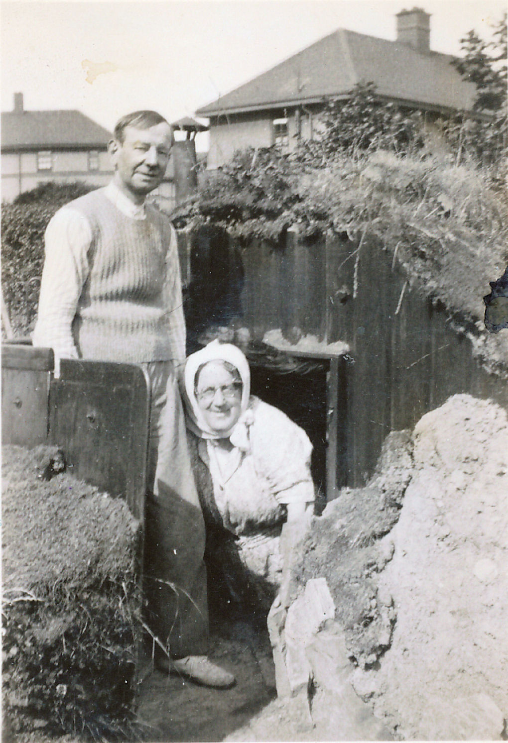the couple emerging from their bomb shelter in the back garden that they sent