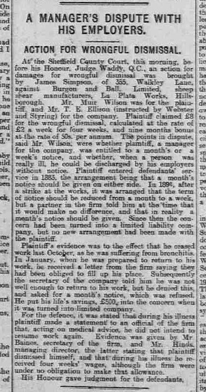 James legal action against his employers stem from the industrial dispute of 1894 in which a limited liability company was formed. It was the "new development in trade unionism" that was highlighted earlier in the article. It is apparent from the report that James had his terms and conditions of employment altered in 1894 when his notice period was reduced from 4 weeks to 1 week. The fact that a partner in the firm had given him a verbal assurance that nothing had changed and that his notice period was still 4 weeks is more or less heresay . He should have got this verbal assurance in writing. Similarly we have only got verbal testimony from the company about was was said between James and his employers prior to his dismissal - there appears to be nothing in writing apart from the letter from the company in which it was stated that he had dismissed himself. James believed he did not dismiss himself but looking at the actions of the company I am more inclined to side with James. James contracted bronchitis in October but when he was fit enough to return to work three months later he was told that his job had been filled and that he was in effect unemployed. Why did they not convey this information earlier when the job was filled?