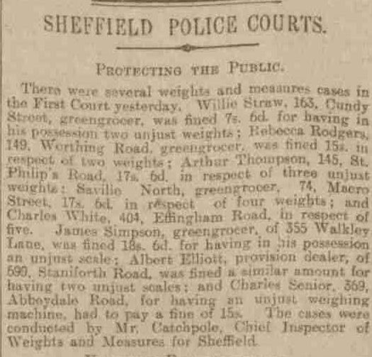 But James and his family did remain at 344 Walkley Lane. Three years later the Sheffield Daily Telegraph dated 3rd June 1904 reported that JAMES by now a greengrocer had been fined for having in his possession an unjust scale. The fine was about £75.00 in today's money