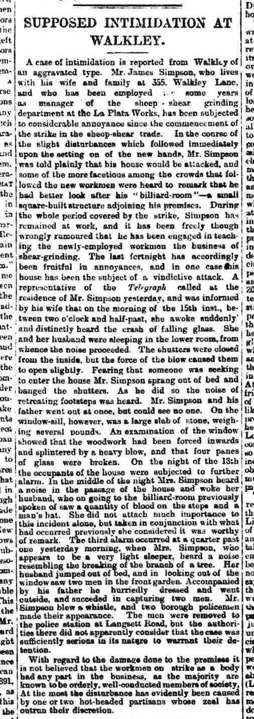 The police and the authorities certainly applied a light touch to the intimidation and threats to James and his family. And the report in the Sheffield Daily Telegraph certainly plays down any connection between the striking employees of Burgon & Ball and the intimidation that was shown on a number of occasions to James and his family.