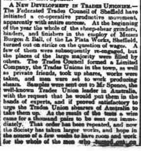 But the situation was made clearer in 1894 when this disturbing report appeared in a local newspaper. The Sheffield Daily Telegraph dated 30th May 1894 had the following report where it stated that James was the manager of the sheep shear grinding department at Burgon and Ball's La Plata works at Malin Bridge. It appears that there was a strike at the works and instead of negotiating, the company merely employed new labour. And it was alleged the James as manager had taught these new employers the business of Sheep shear grinding much to the annoyance of those on strike. James as a manager remained at work but the paper notes that he did not train the new recruits as local rumour had it. Nevertheless local opinion was hostile to James and his family and his house came under attack on several occasions.