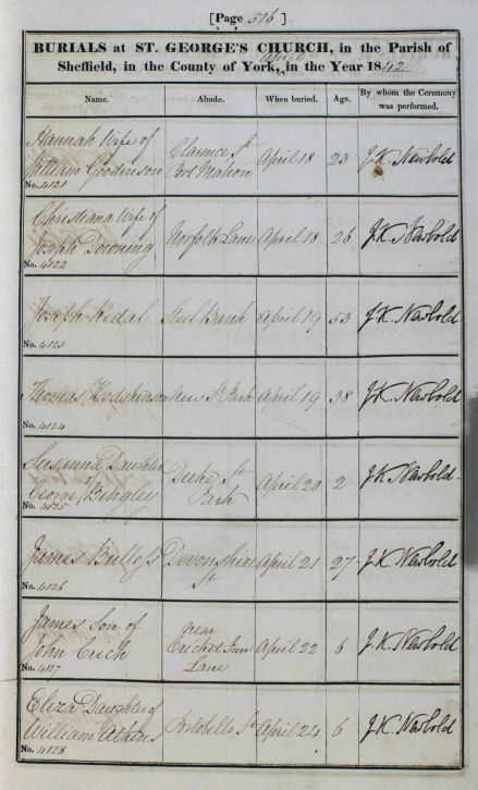 In the summer of 2016 I did make some progress on this line of my ancestors. I found this record of Joseph's burial in St Georges Church Sheffield on 19th April 1842. He was 53 years of age and was a resident of Steel Bank Sheffield
