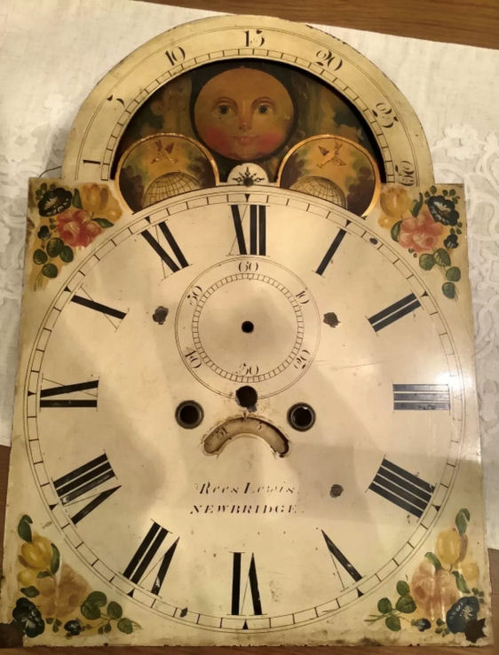 In May 2021 I received an email from a reader of this article who sent me three images of a clock that bore the makers name "Rees Lewis Newbridge"