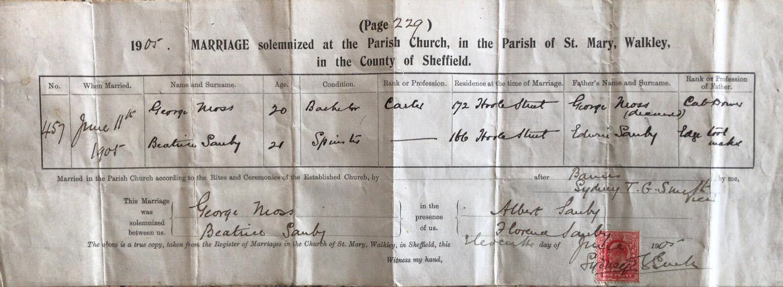 SANBY, Beatrice (Spinster, age 21, residing at 166 Hoole Street). Married George MOSS, on June 11, 1905, by Sydney T G Smith (Banns) at St Mary, Walkley. Father's name Edwin Sanby (Edge Tool Maker).Married in the presence of Albert Sanby,Florence Sanby.Page No: 229 Reg No 257