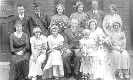 For a number of years I thought that this was the only photograph I'd got of GEORGE and HESTER MOSS. But in February 2008 I was contacted by a descendent of George and Hester who confirmed that a previously unidentified wedding photograph I had posted to another page was in fact the wedding of GEORGE and HESTER. The only information I had was on the reverse side of the photograph - a date 15th April 1933. The only other indication on the photograph is that it was taken outside the "Guild Room" which seems to point to the fact that the photo was taken at the Reception rather that at the Church. The descendent confirmed that this was the date of George and Hester's wedding. The lady to the right of the bride Hester, sat on the end, is ROSE GILLOWAY who was Hester's mother. As it is a wedding photograph, it is safe to assume that it is George's mother BEATRICE who is sat on the left. (The likeness between Beatrice and my gran Rose is remarkable)