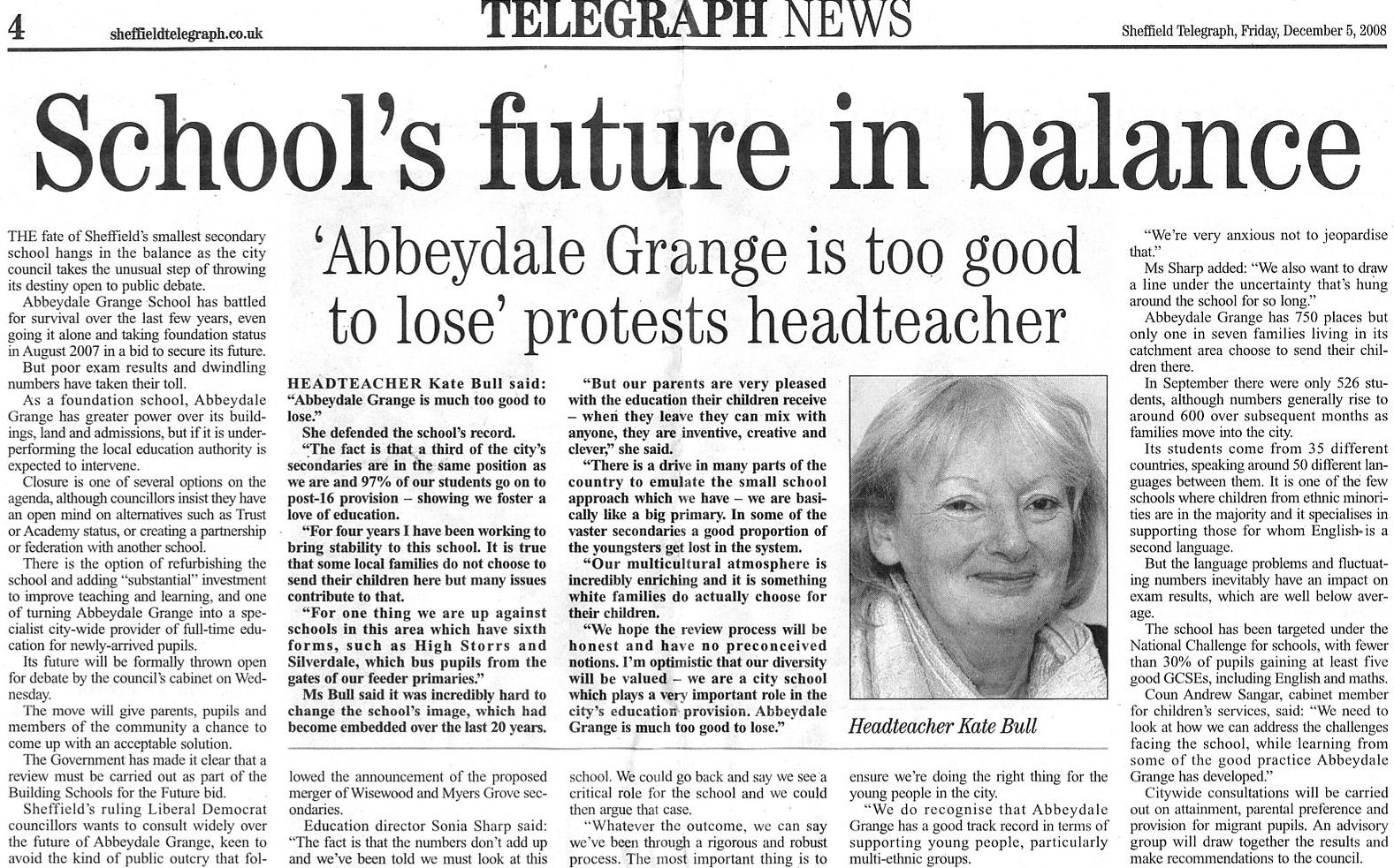 Last year Abbeydale Grange became a Foundation school, taking over greater control of its grounds and buildings in a move which governors believed would give the secondary more autonomy from the city council and help guarantee its future.