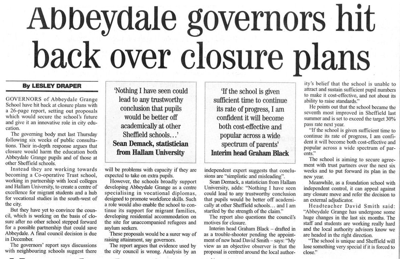 Appeals to the various pro-business parties making up Sheffield City Council have proved to be a dead end. The school and its governing body have appealed to an independent adjudicator, but all the mechanisms for closure are in place. Parents have been given until the end of January to choose a new school for their children, and some have already left; Abbeydale Grange is no longer on the list for parents to register as a choice next year.