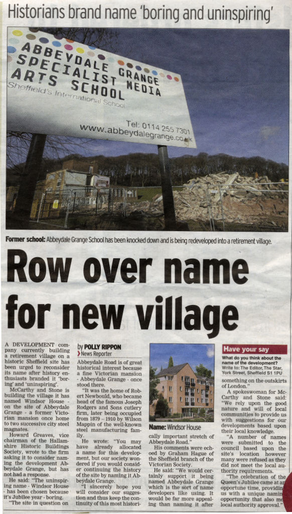 I could have given them a number of suggestions about the naming of the proposed development that would have genuinely reflected the history of the site. But sadly they did not call me. Instead I just contented myself with the knowledge that I have been right all along. The developers McCarthy and Stone are a national firm of property developers who specialize in retirement properties for the well-heeled middle classes. This is a report that appeared in the Sheffield Star dated Wednesday 14th November 2012