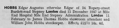 Edgar was the only one of the HOBBS brothers never to have married but he did live for a number of years with a house-keeper and her son. Prior to the war this was off Salmon Lane in the Limehouse area of London. I do not know much about Edgar beyond the fact that his house was flattened by a German bomb during World War 2 and that he lived with his brother WILLIAM HOBBS in Upney until he was re-housed. I found a envelope postmarked 8th April 1946 when I was sorting through some of my fathers papers which gave the address of a Mr E Hobbs as being 24 Ropery Street, Bow, Mile End, London E3. I can only assume that he moved back into London after the war. A photograph of Ropery Street taken in 2004 is shown below.