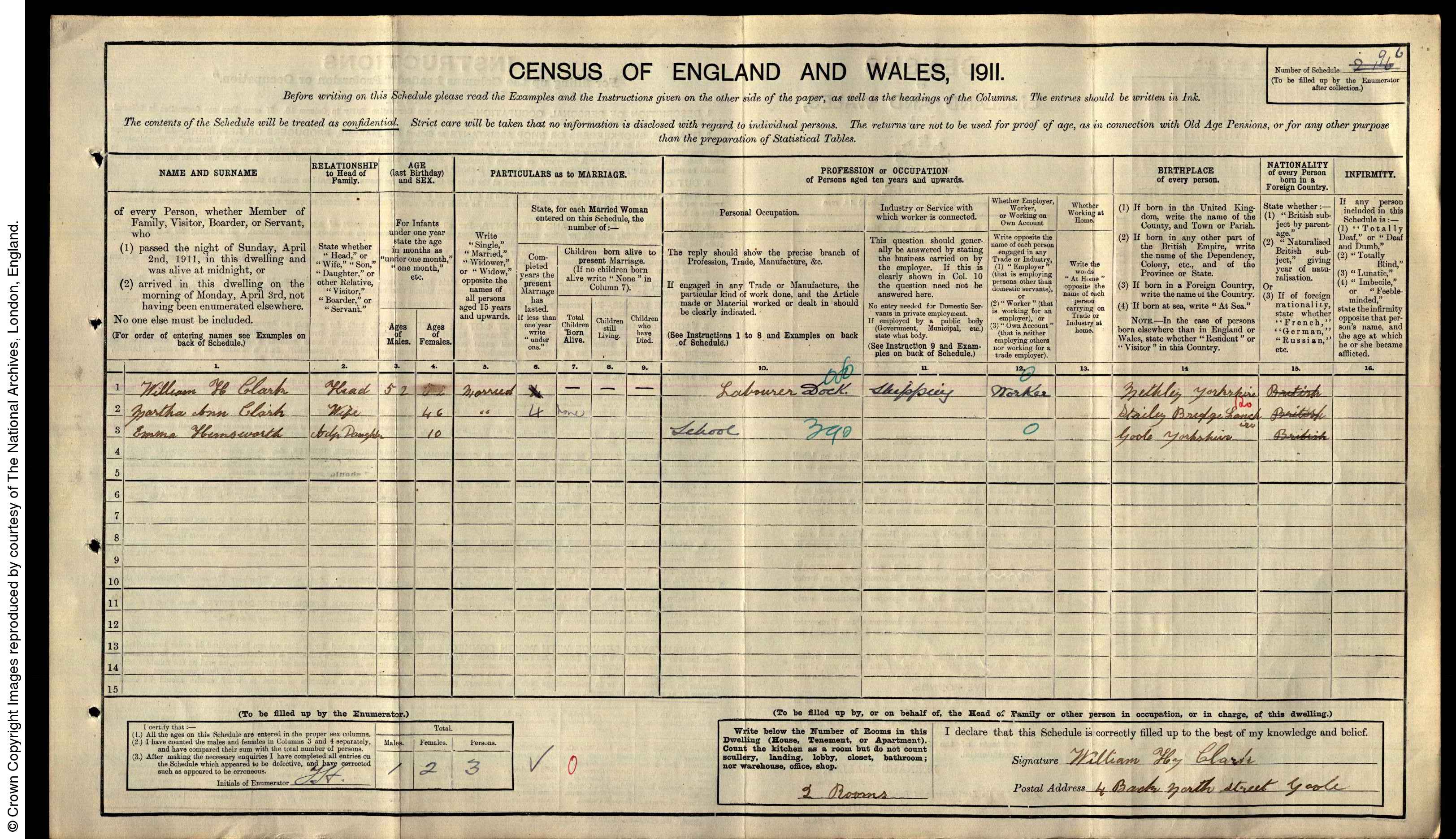 But I can find no trace of HARRIET in the 1911 Census but her 10 year old daughter EMMA is listed. She is living with a WILLIAM and MARTHA CLARK and is listed as either a step daughter or adopted daughter. I cannot make it out but I feel that the latter is correct