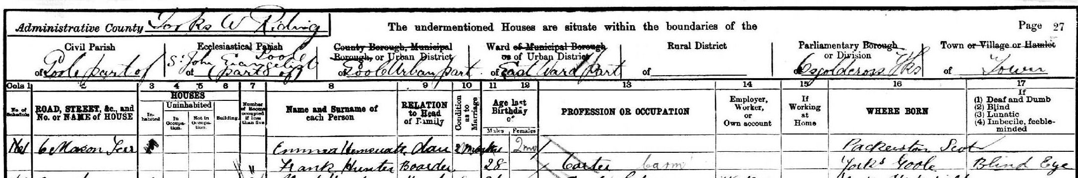 As for her daughter EMMA HEMSWORTH the 1939 National Register has her located in the County Poor Law Institution at 65 Boothferry Road in Goole East Yorkshire. She is single and her occupation is given like all the others in the institution as retired. EMMA was just 38 years old