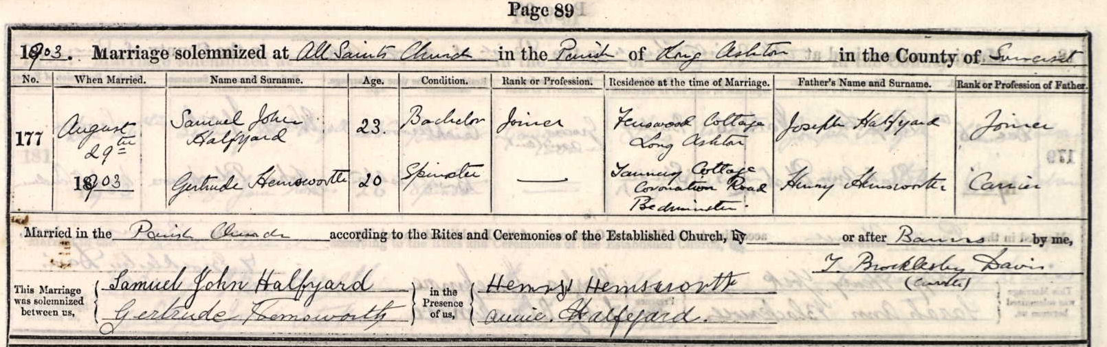 The next reference to the family I have to date is the marriage of their daughter GERTRUDE in the Long Ashton district of Bristol in the September quarter of 1903 ((PRO Ref Volume 5c Page 1177). She married a SAMUEL JOHN HALFYARD who was 3 years older than GERTRUDE