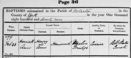But there is a mystery here. In the 1881 Census Henry's wife Ann Hemsworth (nee Hague) is living with her parents Benjamin and Harriet Hague as was her 2 year old daughter also called Harriet. Her status is Married. Harriet Ann was baptised on 23 February 1879 at St John's Church Owlerton Sheffield and her parents are Henry and Ann Hemsworth