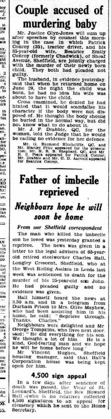 FATHER IS SENTENCED TO DEATH FOR KILLING IMBECILE SON PLEADED GUILTY, WILL RELY ON MERCY OF CROWN Charles Hall, aged 65, a retired steelworker and widower of Longley Crescent Longley Estate Sheffield was sentenced to death at Leeds Assizes yesterday after pleading "Guilty" to murdering his 24 year-old son John, who was an imbecile. The son was found dead in a gas filled room at his home on October 15. The proceedings only lasted five minutes. Hall appeared in the dock wearing a hearing aid. After Hall's plea, Mr. Justice sable asked Mr. J.F. Drabble Q.C. defending "Have you fully explained to him the implications of the course he has taken" Devoted Care Mr. Drabble replied that he had, and that Hall had fully understood the consequences. The course Hall had taken had caused extreme anxiety to those who advised him. The son he had killed had been an imbecile from birth.. He was unable to talk properly and was unable to attend to his most elementary needs Hall and his wife had given devoted attention to the boy until his wife died four years ago from cancer. Since then Hall had given the same devoted attention to his son until the strain of it resulted in a breakdown in his health. He believed the , he himself, was suffering from cancer, despite repeated assurances form doctors that it was not so. At the age of 65, Hall found himself quite unable to render to his son the service he had rendered for 24 years. In a fit of depression he though that the only way he could solve this apparently insoluble problem was that he and his son should die together. His son died and he nearly died too. Two Photographs Counsel said that it was fair to say that it was extremely difficult to find an answer to the charge but it was Hall's desire that he should answer honestly the charge put to him. Mr. Drabble said that there were two photographs of the son that he would like forwarded to the minister. The Judge: You wish the photographs and additional evidence which is not on the depositions to go to the appropriate Minister - Yes Turning to Mr. J. Basil Herbert Q.C. prosecuting the Judge said " On the information available to the Crown, do you know of any reason why I should not accept the plea?" Mr. Herbert replied "Not that I know of. " The Judge: "He is fully rational and fully aware of the course he has taken"Mr Herbert: "It seems to be so" Sentence of death was then passed and after Hall had been led from the dock, the judge said to Mr. Drabble " Under the circumstances, I think it was a perfectly proper course to take" |