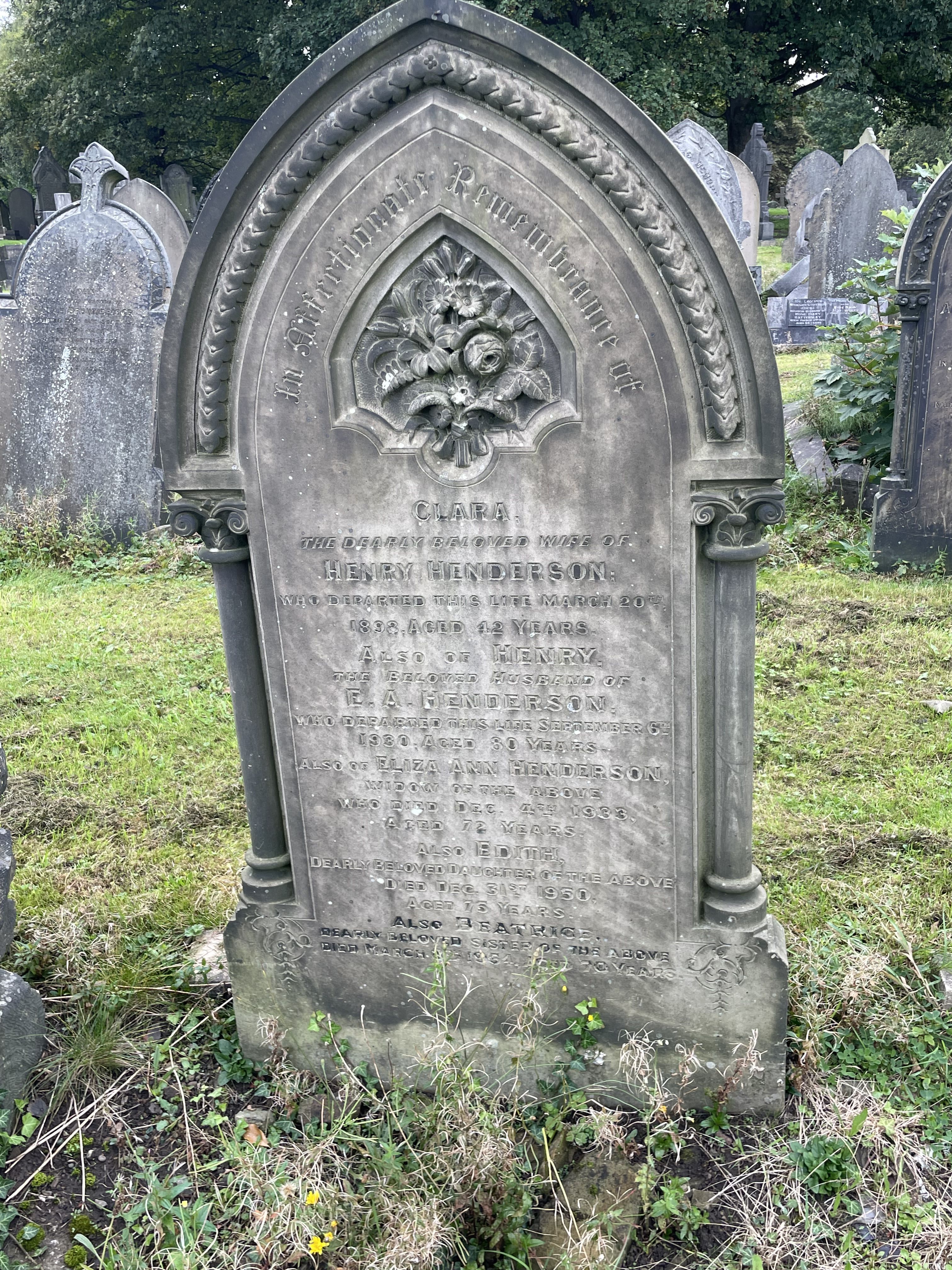 Henderson, Beatrice (Spinster, age 70). Died at 49 Greystones Grange Road; Buried on March 13, 1954 in Consecrated ground; Grave Number 9724, Section S of City Road Cemetery, Sheffield.