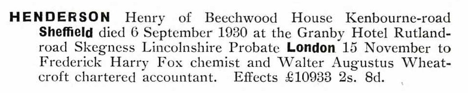 Henry's Burial Record at Sheffield's City Road Cemetery. He died whilst on holiday in Skegness in September 1930
