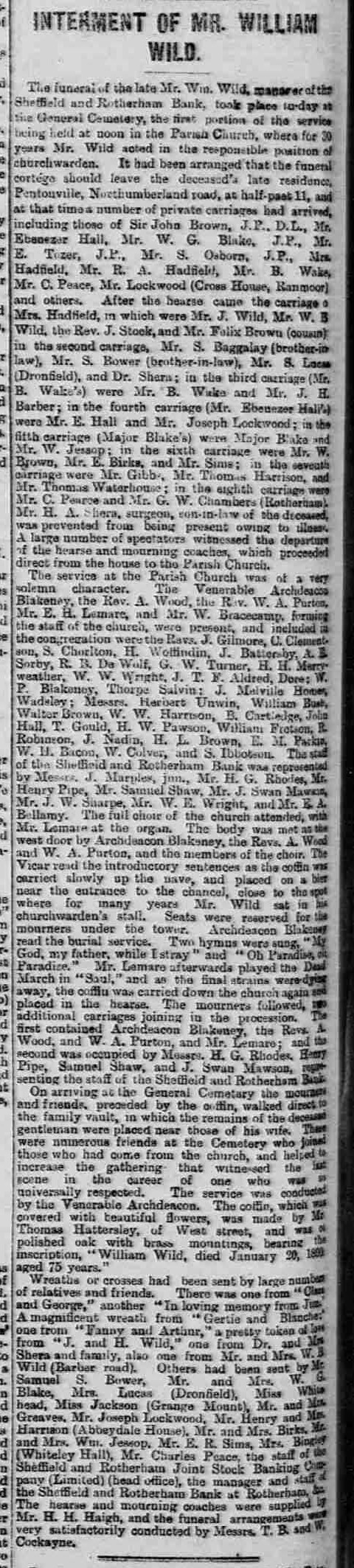 The following is the burial record for Mr. William Wild, a prominent person in nineteenth century Sheffield. He was interred in Sheffield's General Cemetery on 24th January 1890.