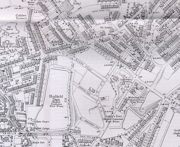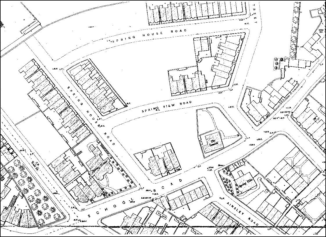 Spring Hill is on the right of the map below Ainsley Road. In the course of posting the information I was contacted by John Slater whose ancestors were closely associated with Spring House which is on the corner of Spring House Road and School Road. In fact. Spring House Road was built across the back garden of Spring House. A Purchase Deed dated 30th June 1899 states that Spring House was actually sold by William Fisher Tasker of the City of Sheffield, an accountant. It was bought by James (of 35, Granville Street, Hardware Dealer) and Harriet Johnson (his wife) and Warrington Slater. However, in the text it says "lately used and occupied therewith by the said Ellen Eadon" and the ground also includes "Spring View" aka "The Laurels."