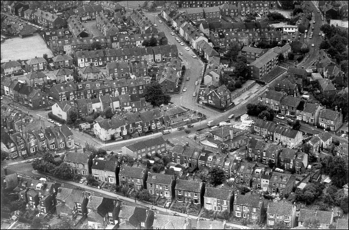 This aerial photograph of Spring Hill was taken circa 1980. The road that disects the picture is School Road - Commonside. Starting on the left of the photograph the first road that leads off School Road to the right is Conduit Road. The bottom of Conduit Road joins Crookesmoor Road at the junction with Northumberland Road. The second road that leads off School Road to the right is a cul-de-sac Ainsley Road. At the top of Ainsley Road was the bakery of Thomas Jewitt and Son. Adjoining the bakery is the car park which was used to park the firm's delivery vans. A number of vans were in the park when the photograph was taken which may indicate that it was sometime in the early afternoon when the photo was taken.