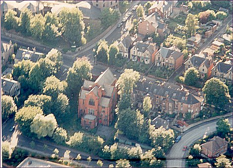 There is another arial photograph taken in the summer of 1989 probably June. This shows the area to the bottom of Spring Hill where it joins Crookesmoor Road. The road in the bottom right is Harcourt Crescent. The building in the centre is the Unity Church which was sold soon after the photograph was taken. The purchasers were developers acting on behalf of the University of Sheffield who promptly gutted the interior of the Church and converted the building into student accomodation. The building to the top of the photograph is also owned by the University and houses the University's Law Department. The road outside is called Conduit Road and joins Crookesmoor Road with School Road. Crookesmoor Road incidentally runs diagonally across the centre of the photograph